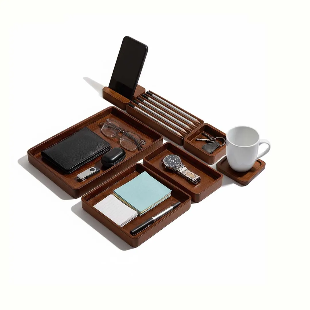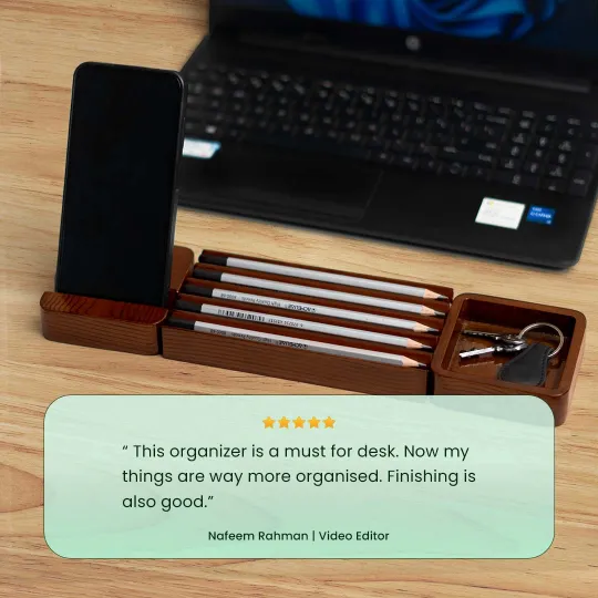 Desk Organizer Combo Set is made from glossy lacquer-varnished wooden board. This combo keeps your desk clutter-free by providing dedicated spots for everything from pens and wallets to staplers and notepads.